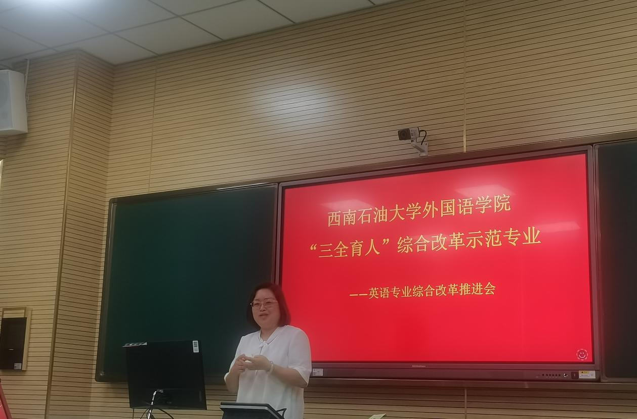 为贯彻落实全国教育大会精神,培养德智体美劳全面发展的社会主义建设者和接班人,加快推进教育现代化、教育强国建设,办好人民满意的教育,西南石油大学外国语学院于2021年5月27日召开“三全育人”综合改革示范专业——英语专业建设推进会。本次推进会由外国语学院英语专业教研室党支部书记孙越川老师主持。