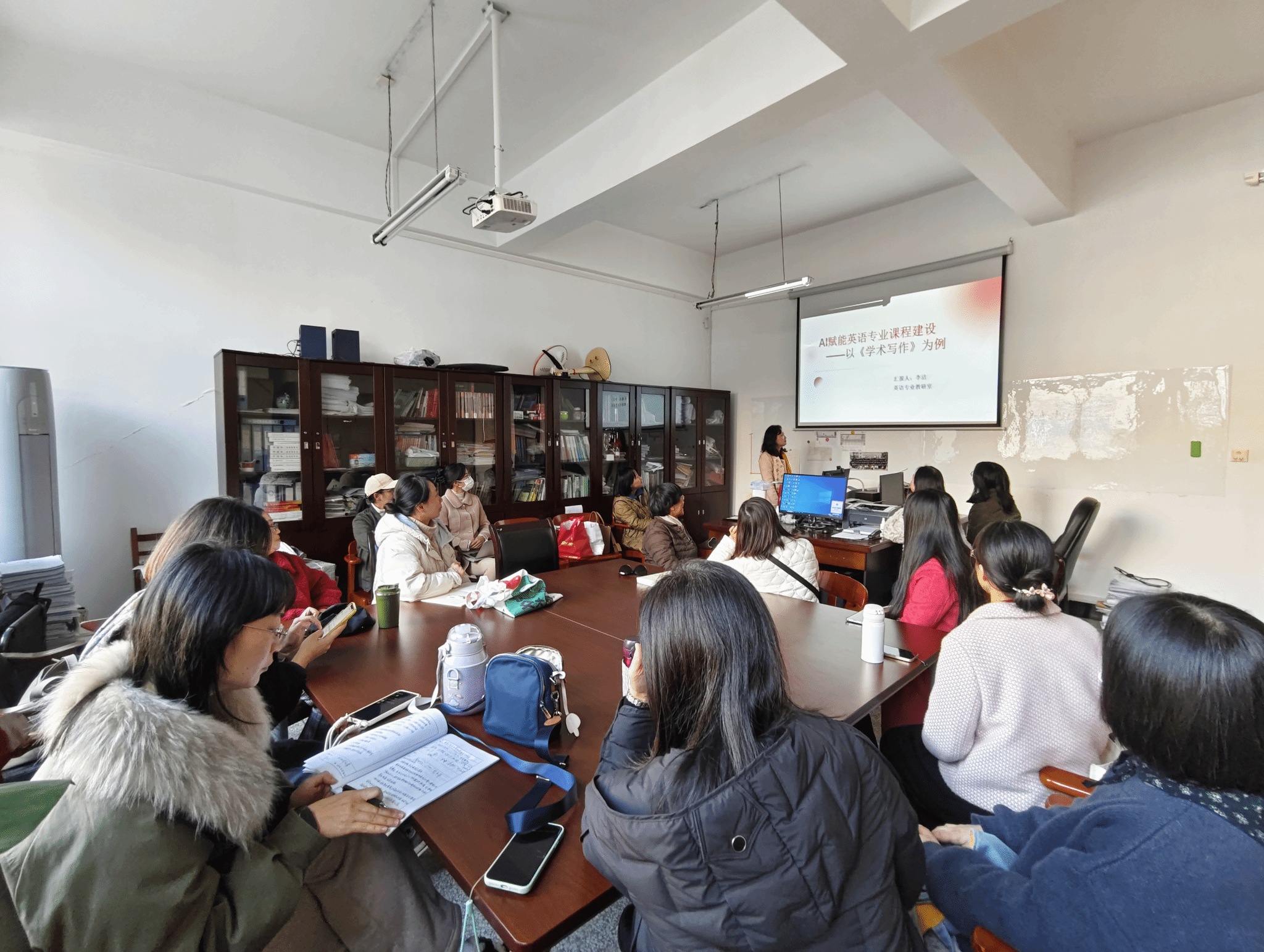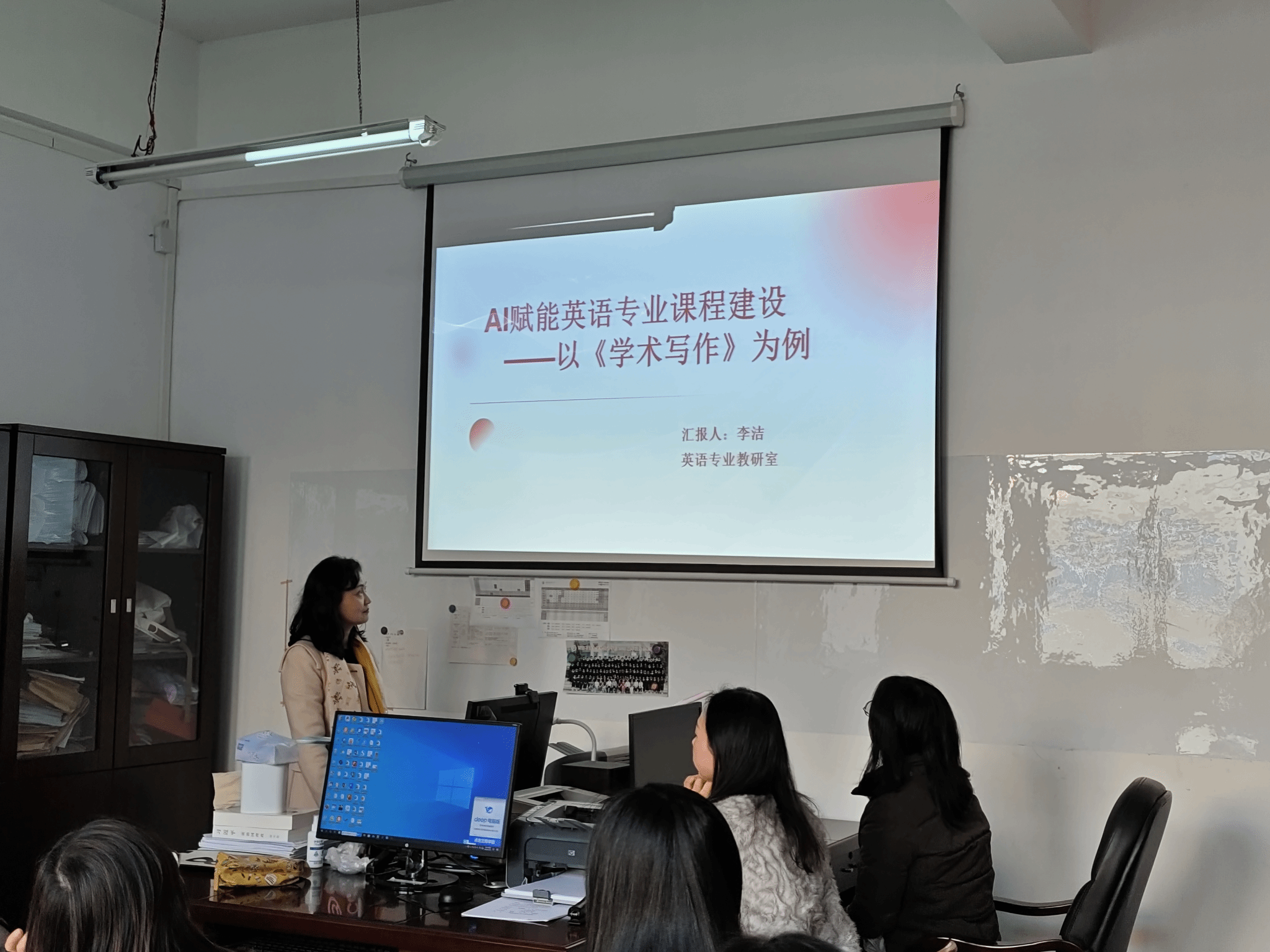 2025年11月20日下午,英语专业教研室成功举办“AI赋能英语专业课程建设”专题教研活动,全体教师齐聚一堂,共探智能技术与英语教学的深度融合之道。活动中,李洁老师以《学术写作》课程为例,分享了 AI 工具在论文构思、文献管理等环节的实践经验,引发与会教师围绕技术适配、角色转型等议题展开热烈研讨。
