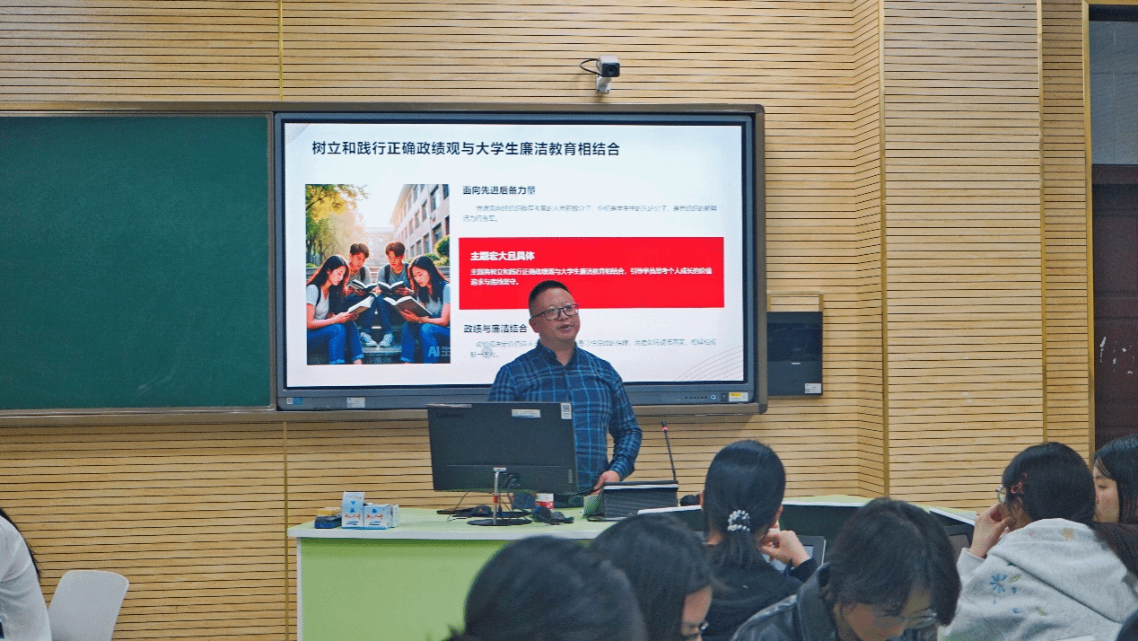 周永华围绕政绩观与廉洁自律的内在关联、政绩观偏差及“微腐败”风险警示、践行正确政绩观与廉洁自律的路径三个方面,进行了系统深入的讲解。他强调,正确政绩观是青年成长路上的“定盘星”,廉洁自律是守护初心使命的“护身符”,二者辩证统一、相辅相成,是青年学子成长成才的重要根基。结合当代大学生群体中可能存在的政绩观偏差、“微腐败”潜在风险,周永华语重心长地提醒同学们,为民造福的初心的体现在服务同学、奉献集体的具体行动中,而非盲目追求高绩点、堆砌简历亮点,要坚决摒弃“重形式、轻实效”的不良倾向,时刻绷紧廉洁之弦,严防小问题演变成大错误,守住青春底线。