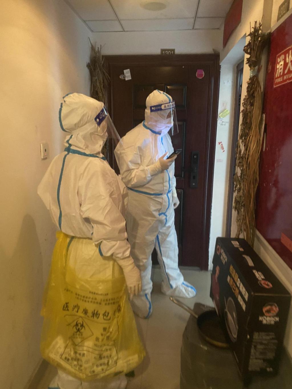 此时,51栋正在进行封控工作,要求住户足不出户,实行5天5检居家隔离。当前,最急迫的工作就是尽快对51栋四个单元进行上门核酸采集,志愿者们来不及去石油缘宾馆安排住宿,就地开展上门核酸检测准备工作。下午两点半,上门核酸检测工作正式开始,由于只有两名医生,所以首批8名志愿者分成两个组,一组负责一、四单元,二组负责二、三单元。志愿者老师们进入51栋前,必须做好全身防护,要穿戴好防护服、帽子、面罩、口罩、手套。陈波老师所在的二、三单元组从下午四点开始对100来户开展上门核酸检测工作,陈波老师主要负责住户的信息核对登记工作,另一名老师负责扫码登记工作,医生负责核酸采样工作。通过对两个单元每家每户的认真仔细核对及核酸检测,晚上,51栋四个单元的上门核酸检测工作顺利完成。封控区志愿者在指定地点按正确步骤脱下防护服,再由专车送往石油缘宾馆安排住宿。大家都严格落实疫情防控主体责任,做到不聚集、除工作外不离开宾馆的要求。