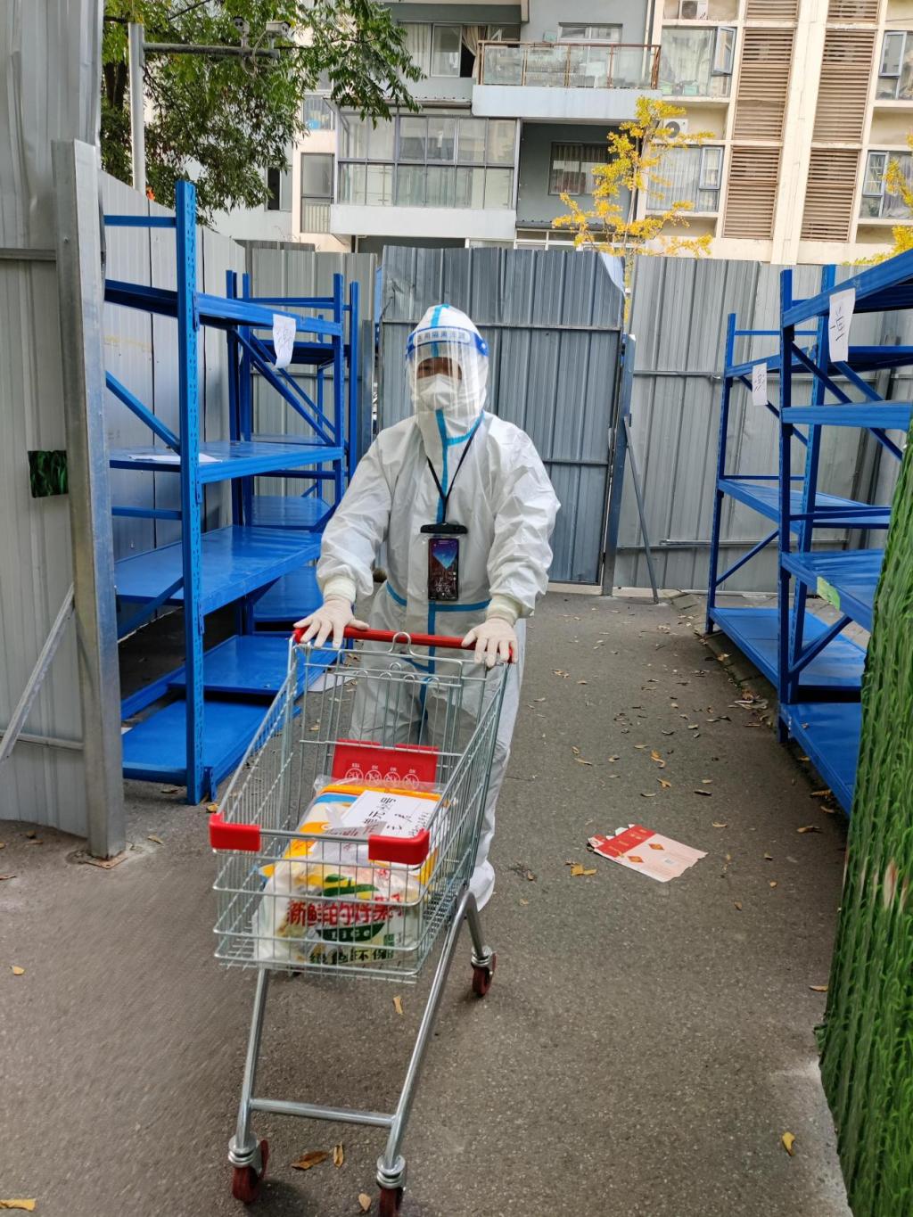 20日,陈波老师被分配在第一组,早上在开展上门核酸检测时再次核对住户的信息登记工作,下午完成物资配送工作。一般上午进行核酸检测工作,下午和晚上进行物资配送工作。高风险区的住户通过网上下单,备注楼栋、单元、房间号,先由快递、外卖送到小西门,小西门物资配送组统一送到51栋楼下物资分配站,再由51栋志愿者老师分送到每家每户。