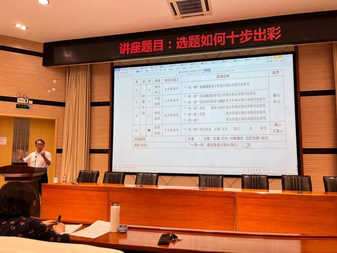 4月20日下午,两位专家先后为我院及全校师生就“学”与“术”两大主题展开了精彩纷呈的讲授。刘教授《符号景观:多符聚焦》一讲从符号学角度阐释了语言景观汉外语对译的现状、问题与解决模式,强调学术研究应扎根泥土、固本拓新,以家国情怀与责任感解决真问题。黄忠廉教授更凭借其妙语连珠的讲解、诙谐幽默的风格与睿智深刻的思想,从“看山是山”“看山非山”与“看山只是山”三个维度,以《选题如何十步出彩》为题,深入浅出地点出了炼题机制的诀窍与关键,凸显了“为学之道,贵在得法”的核心要义,在听众们获益匪浅的感慨中,将首日讲学推向高潮。