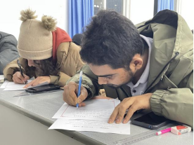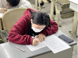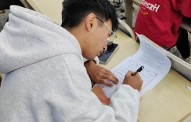本次书写大赛分为英文组、中文组(留学生)与他语种组(日语、西班牙语、法语、俄语)三组,比赛当天,来自各学院的参赛选手齐聚思学楼,用钢笔、彩色签字笔、毛笔等多种书写工具抄写“一带一路“金句,展示他们独具魅力的书写风采。在中文组考场,我们还能发现特别的一幕,一位留学生专注地握着毛笔,轻轻蘸取墨汁后坚定落笔。笔画间,金句逐渐浮现在纸上,一笔一划体现了中国历史的延续和文化的传承。