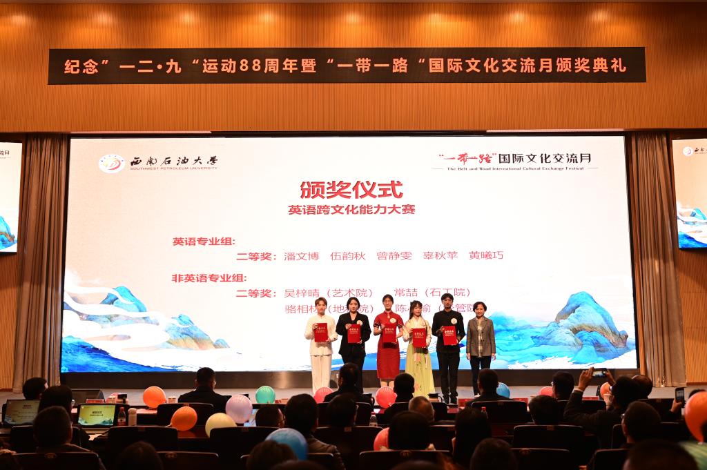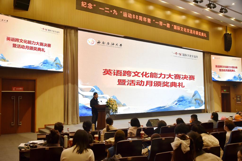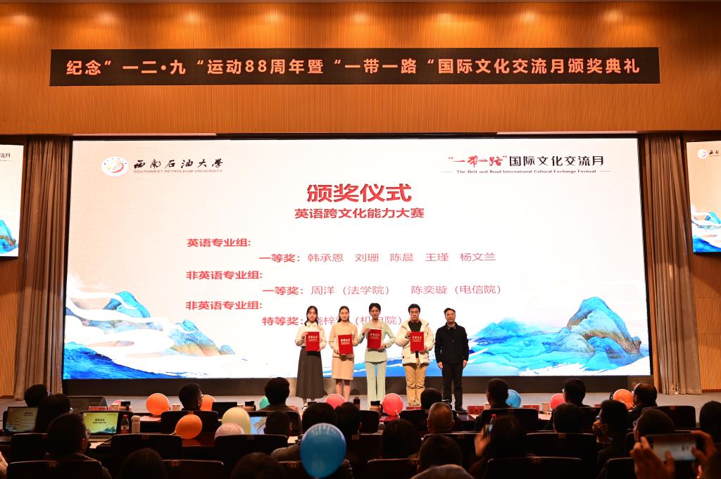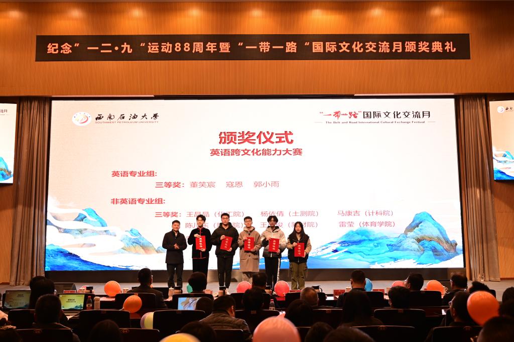12月8日下午,西南石油大学纪念“一二·九”运动88周年暨“一带一路”国际文化交流月颁奖典礼在成都校区图书馆学术报告厅举行。学校党委书记张烈辉出席并致辞,党委常委、副校长刘向君、周莹出席活动。