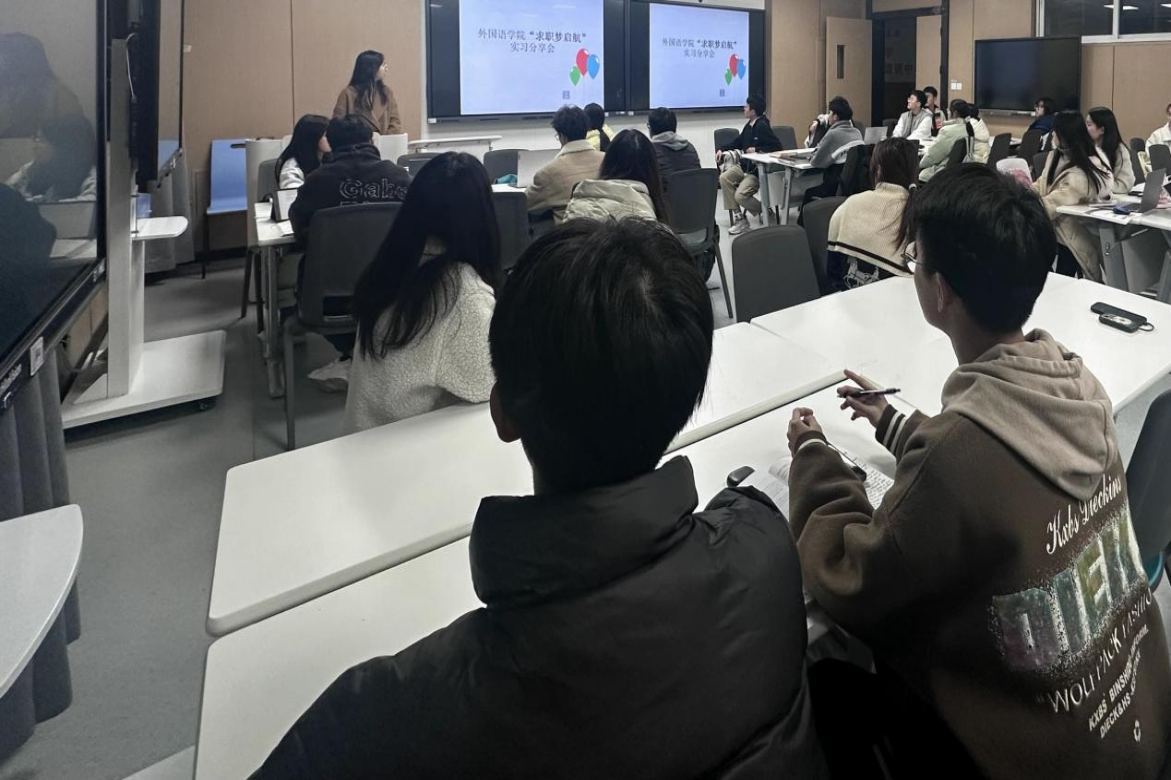 2023年11月29日,外语院“求职梦启航”实习经历分享会于博学楼A104顺利举办,外语院辅导员李飞出席本次活动。