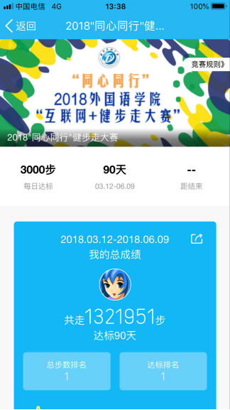 从比赛结束的赛果来看,50%以上的教职工完成了超过50万步,平均每日超过5000步的成绩。黄丽老师更是以1321951步的总成绩,连续90天,日均15000步的成绩荣登榜首!