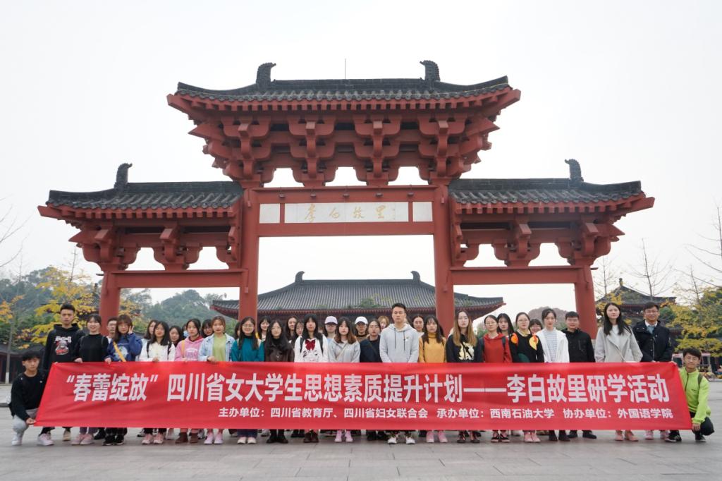 2020年11月,外国语学院组织学生赴江油市“李白故里”开展研学活动。此次活动作为“春蕾绽放”四川省女大学生思想引领系列活动之一,由四川省妇女联合会、四川省教育厅、四川省互联网信息办公室主办,西南石油大学承办,外国语学院协办。此次活动通过了解李白生平故事,领悟古人智慧,体验和学习古典诗词文化,以此来提升大学生思想素质。