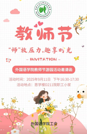 金秋送爽,桃李芬芳。在第41个教师节来临之际,外国语学院于9月11日下午在院职工小家举办了以“‘师’放压力,趣享时光”为主题的教师节游园活动。本次活动由外国语学院工会精心策划,旨在为辛勤耕耘在教学、科研、管理服务一线的全体教职工送上节日祝福,让平日辛勤的园丁们在欢声笑语中舒缓身心、增进情谊。