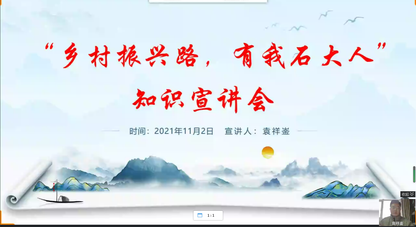 团队于2021年10月30日至2021年11月7日开展了“乡村振兴路,有我石大人”乡村振兴系列活动,积极响应疫情防控,所有活动均采取线上方式进行。10月30日至11月1日,团队面向高校学生群体开展了线上问卷调查,收回有效问卷247份,了解了乡村振兴战略在高校的宣传普及状态和对身边“乡村振兴”典型案例的感受。11月2日,团队成员通过视频会议的形式采访了岷江桂花村党委书记陶勋花,陶勋花书记为大家讲解了岷江桂花村的近年来的巨大变化和基层公务人员工作现状,队员们认真聆听了“乡村振兴”在乡镇基层政府的一些具体实施方案,提高了对“乡村振兴”战略的认识。11月2日至11月4日,团队以党团组织为依托,开展了乡村振兴战略线上讲座,共200余人参与,讲座分别涵盖了“乡村产业振兴”、“乡村人才振兴”、“乡村文化振兴、“乡村生态振兴”、“乡村组织振兴”五大方面,全面深刻地加深青年学子对乡村振兴政策的认识和理解。11月6日,团队开展了“乡村振兴路,有我石大人”—知识竞赛,竞赛进一步加深了青年学子对乡村振兴的认识和理解,增强了参与乡村振兴的责任感和使命感,为助力乡村振兴打下了坚实的基础。