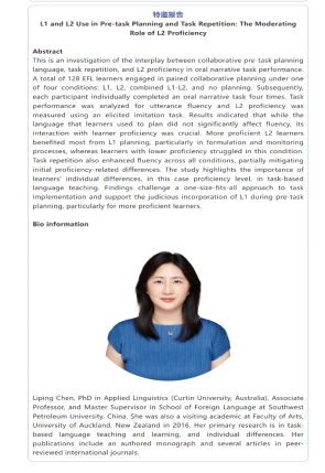 陈丽萍博士在报告中指出,在英语口语教学的任务准备阶段,第一语言的使用对高水平学习者的口语流利度发展有益,但对低水平学习者则可能造成阻碍。她呼吁教师在任务型语言教学中,根据学习者的水平灵活调整任务设计,以提升教学的有效性。报告结束后,与会人员积极提问,充分肯定了陈丽萍博士的研究成果。这次交流展示了我院教师在任务型教学领域的科研实力,进一步提升了学院的国际学术影响力。
