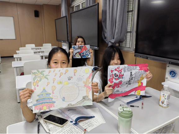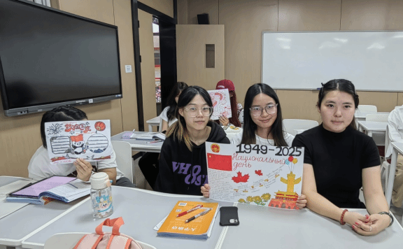 同学们围绕“团圆”与“爱国”核心主题,将中俄文化元素巧妙融合。板报中,彩笔勾勒的圆月与长城相映成趣,俄语书写的“С праздником середины осени!”(中秋节快乐)与“С национальным днем!”(国庆节快乐)祝福语醒目工整,更穿插“Лунный пирог“(月饼)、“государственный флаг ”(国旗)等双语词汇注解。从版面设计到内容编排,学生们分工协作,用细腻笔触诠释“家国团圆”的美好寓意。