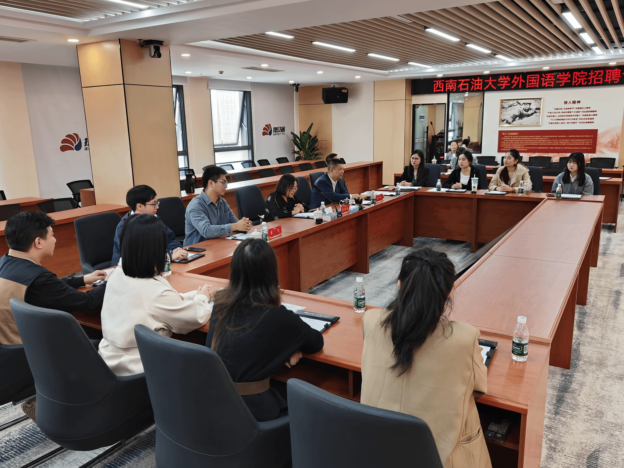 10月18日下午,外国语学院院长吕旭英、毕业班辅导员李飞带领12名应届毕业生前往捷贝通石油技术集团股份有限公司(以下简称“捷贝通公司”),参加校企联合举办的专场宣讲面试活动。本次活动通过企业宣讲、师生交流及一对一面试等环节,搭建起毕业生与能源行业领军企业的对接平台,进一步深化了校企合作内涵。