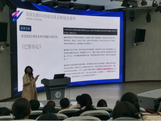 讲座尾声,副院长陈婧代表学院向郭艳卿老师致以诚挚感谢。她表示,本次专题分享为同学们的职业规划提供了全新的参考维度,学院将推进ESG人才培养工作,本学期启动宣讲、开放报名,下学期正式推出ESG人才培养专项课程,助力外语学子把握行业机遇,成长为ESG领域人才。