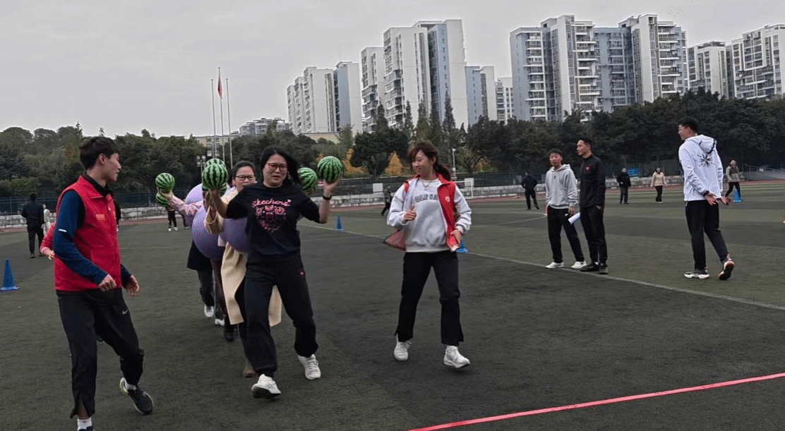 本届体育节的教职工赛事包括“同心鼓”比赛、拔河比赛、“夹球运瓜”竞速比赛、“你抛我接”竞速比赛等多个项目,兼具趣味性与协作性,既体现竞争特征,又突出团队配合要求。在学院工会统筹安排下,教职工积极响应,踊跃报名,以饱满热情参与全部比赛项目。