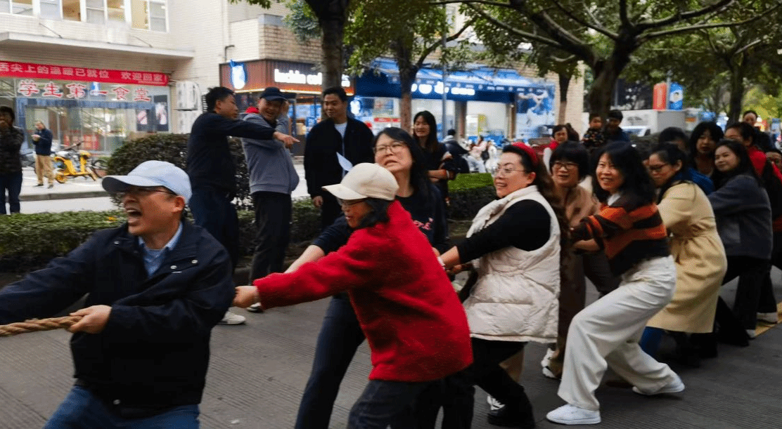 在“同心鼓”比赛中,外国语学院参赛教师围绕共同目标紧密协作,通过稳定的力量输出与精准的节奏控制完成一系列击球动作。在拔河比赛中,我院教职工精神饱满、斗志昂扬,全体队员按照赛前部署迅速进入状态,以稳固的站位、合力的动作应对比赛中的力量对抗。“夹球运瓜”竞速比赛注重协调性和节奏控制。参赛教师在比赛中保持沉着冷静,合理分配力量,展现出良好的参与度和竞技状态。“你抛我接”竞速比赛考验默契配合与应变能力。参赛教师通过不断调整投掷角度与接球节奏,体现出团队间的沟通能力与协作水平。