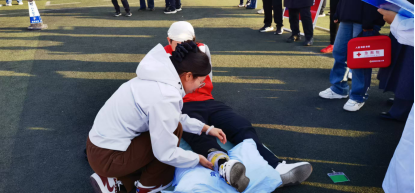 本次比赛共分为消防技能与应急救护两大板块,全面考察教职工在面对火灾及突发伤病时的综合救援能力。我院代表队身着统一的银灰色队服,神情专注,展现出昂扬的斗志和严谨的纪律作风。消防技能竞赛环节扣人心弦,不仅考验速度,更考验细节。根据赛制安排,我院3名“消防”队员先后登场。在水带水枪连接的接力赛中,罗文双、李飞老师配合默契,从收纳水带到抛掷、连接枪头,整套动作行云流水,一气呵成,充分诠释了团队协作的力量。在绳结制作项目中,高逸品老师在2分钟内准确打出了八字结、平结、蝴蝶结和布林结四种专业绳结。随后,高逸品老师迅速奔赴灭火区,严格按照“提、拔、握、压”的规范动作,干脆利落地扑灭火盆火焰。在应急救护环节,我院4名“应急救护”队员钟亮、孟祥丽、程元晨、李凌飞老师在模拟心肺复苏及创伤包扎等场景中,表现沉着冷静,操作规范严谨,展现了对生命的敬畏和专业的急救素养。