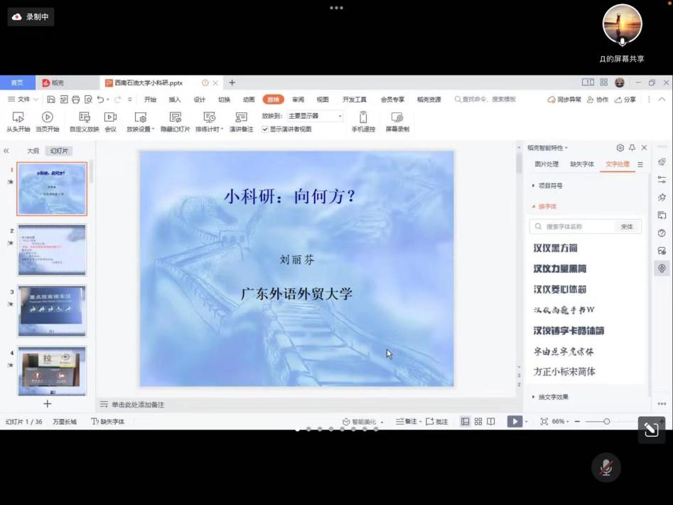9月19日晚,广东外语外贸大学刘丽芬教授应我校人文社会科学处和外国语学院的邀请,做了题为“小科研:向何方?”的线上讲座。本次讲座通过腾讯会议平台进行,由外国语学院吕旭英院长主持。我院部分教师、全体2022级硕士研究生新生及部分2021级、2020级硕士研究生共同聆听了此次讲座。