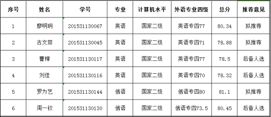 根据《西南石油大学关于在2019届本科毕业生中推荐免试研究生的通知》和《外国语学院2019届本科毕业生推荐免试硕士研究生实施办法》,经过学生本人申请、审查申报材料、组织专业面试等环节。按照总分(绩点+面试+特长)从高到低的顺序,确定2015级英语专业廖明玥、古文菲,2015级俄语专业罗为艺为外国语学院2019届本科毕业生免试研究生推荐人员;确定2015级英语专业曹柳、刘佳,2015级俄语专业周一钦为递补后备人选。