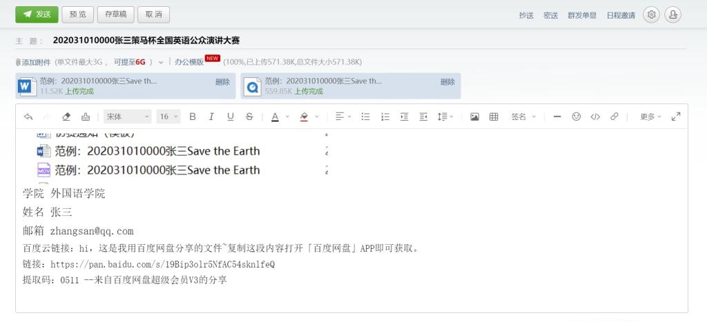 ②按要求录制好的3分钟定题演讲视频,邮件正文附百度云链接(设置永久有效!)。