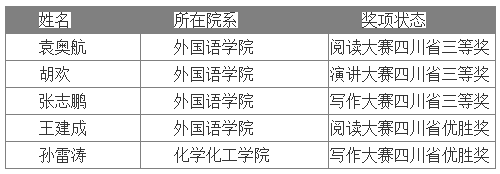 11月2日,五位初赛特等奖选手代表我校参加四川省复赛。四川省复赛有280名来自川内几十所高校的优秀选手参加,省级各赛项分设一、二、三等奖,以及优胜奖。本次比赛竞争激烈,我校选手也在复赛中取得了三等奖3项和优胜奖2项的成绩。我校也荣获“2019‘外研社国才杯’全国英语演讲,阅读,写作大赛初赛优秀组织奖”。
