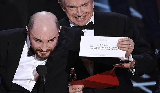 在宣布当晚最后一个奖项时,爱乐之城被提名为最佳影片,当爱乐之城剧组所有人都来到台上时,制片助理们冲到台上再次检查信封。颁奖人沃伦比蒂随后宣称他手中拿的是最佳女演员奖名单。