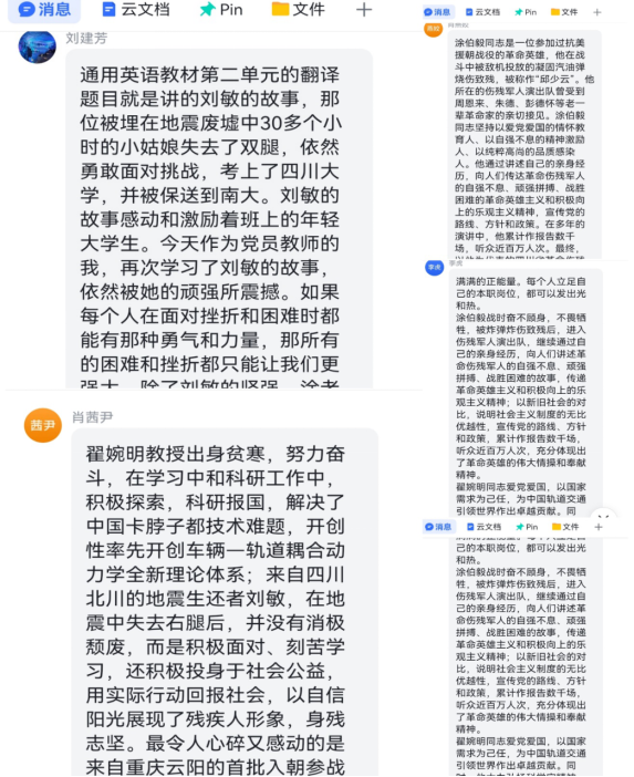 3月30日上午10点,大学英语第一教研室党支部没有教学任务的党员在线观看了在四川大学望江校区西五教演播厅举行的“传承红色基因,争当青年先锋”红色典型进高校宣讲第一场;有教学任务的党员课后在线学习了文字材料。学习结束后,大家深受鼓舞,在飞书群纷纷发表了自己的感想。