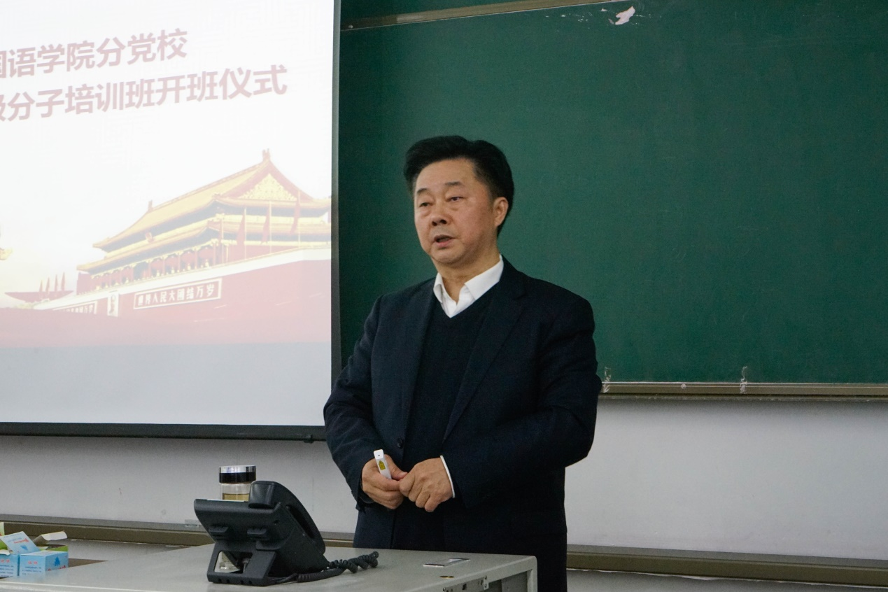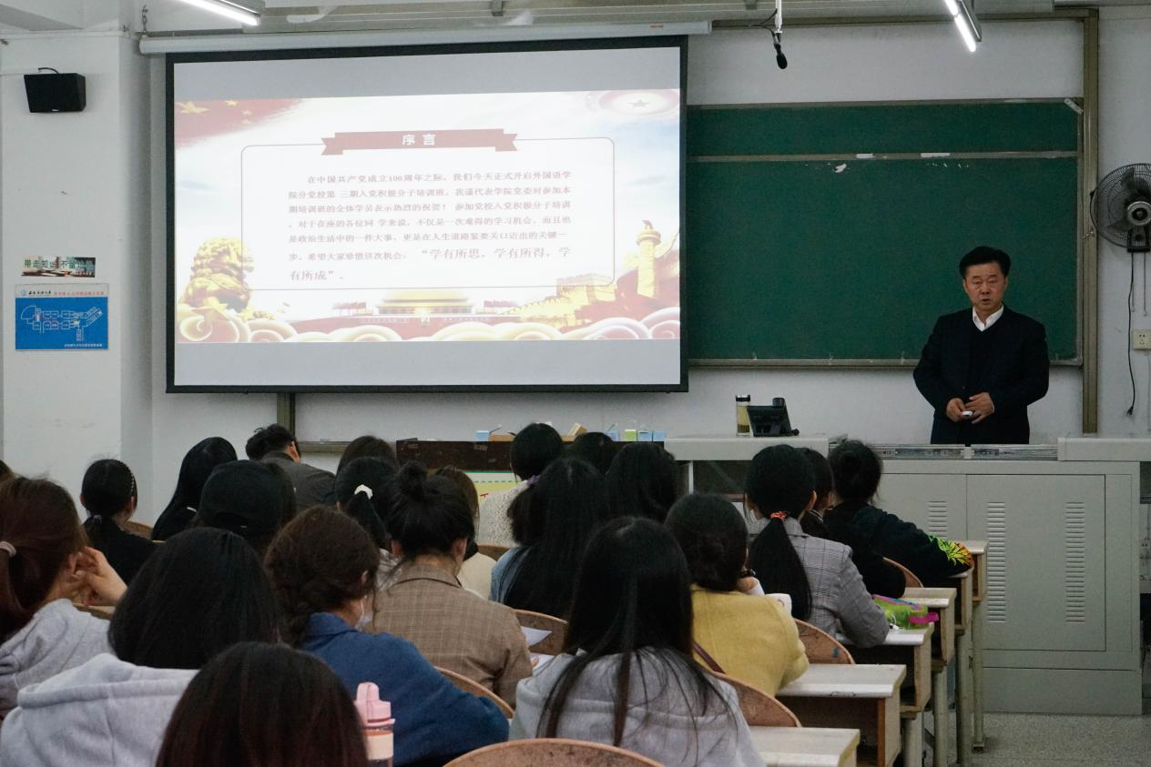 为深化入党积极分子对党的认识,端正入党动机,坚定理想信念,2021年4月11日晚7点,外国语学院分党校2021年春季学期入党积极分子培训班开班仪式于思学楼A413顺利举行。出席本次开班仪式的有外国语学院党委书记杜宗良、组织员任会。开班仪式由分党校指导教师李飞主持。