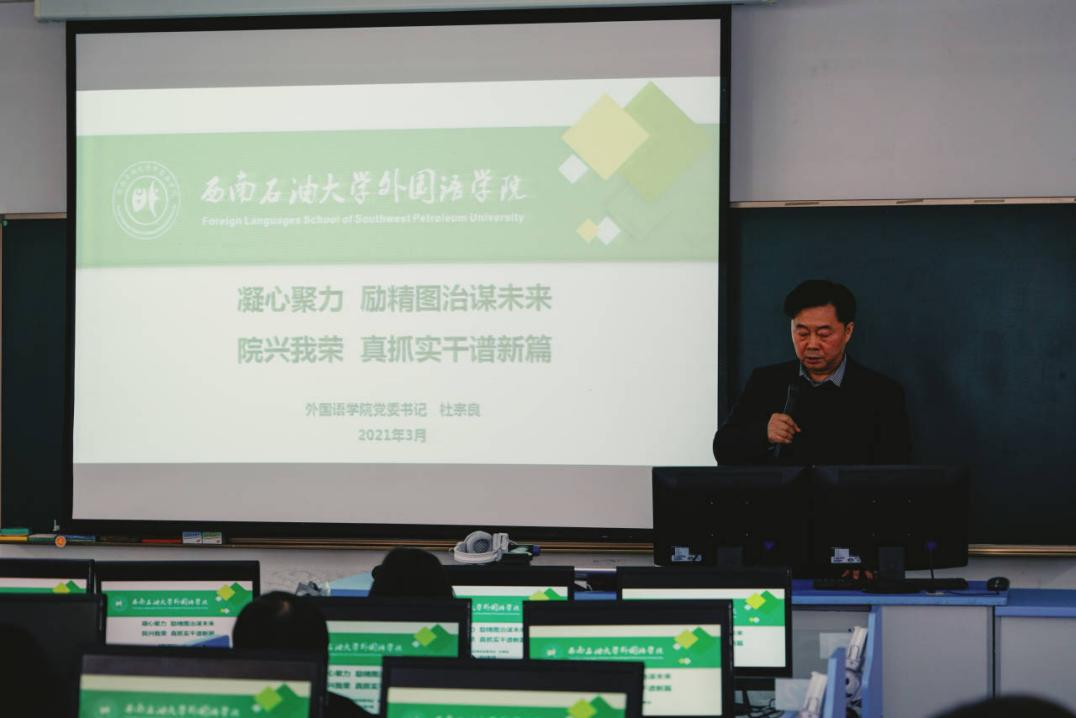 杜书记将2021年发展目标总结为四个关键词——机遇、改革、内涵、质量。新时代给予我们机遇,杜书记谈到:“外国语学院要在一众高等教育外语专业中发挥出西南石油大学的特色,针对英语、俄语专业协同发展,培养特色人才。”在改革方面,杜书记提出“发展中的问题只能用改革的方法来解决”。回顾总结过去,“人才培养、科学研究、服务社会”等工作中仍然存在不少问题,首要任务就需要改革不合理的规章制度。在内涵上,杜书记提到:经过时间洗礼,外国语学院正在从“外延式发展”逐渐向“内涵式发展”转变。最后,杜书记强调“人才培养质量是高等教育的生命线”,外国语学院谨遵“自主设、国家定、市场选”的人才培养方案不断向社会输送人才。