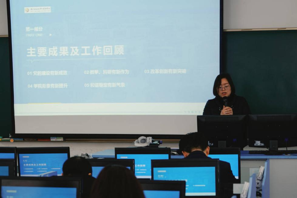 首先,吕院长以“抢抓机遇 深化改革 突出内涵 提升质量”为主题回顾了2018年以来学院获得的主要成果并对上学期的工作进行了总结。她提到,2018年以来,我院在党的建设、教学科研、改革创新、学院形象以及和谐稳定五个方面取得了显著的成绩,其中值得注意的是,在公共外语教学方面,2019级和2020级四级一次性过级率达近年来最高;在英语、俄语专业培养方面,深造率维持在较高水平;在改革创新方面,外国语学院师资队伍逐步壮大,教学环境不断优化。接着,吕院长进行了今后工作的目标规划。吕院长以“以评促建”的方式给全体教职工展示了各项数据,指出了新的一年外语院的工作目标。最后,吕院长落脚于当下,代表学院党政给全体教职工明确了2021春季学期的工作要点,其中包含党建工作、本科教学、研究生学科、科研实验室和学生工作等内容。