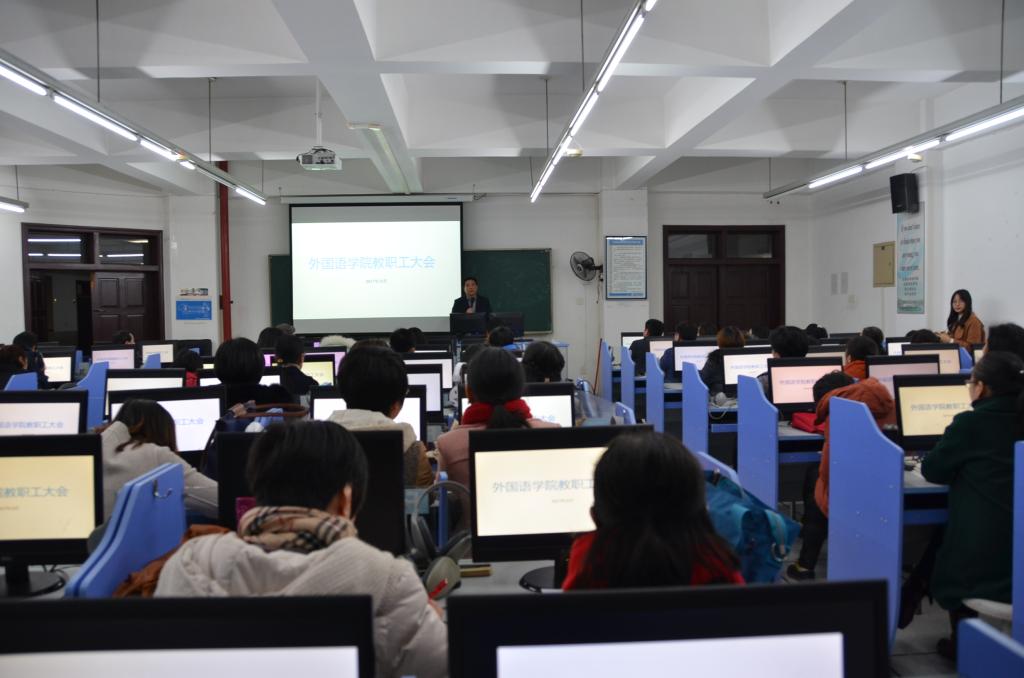 会议最后,外国语学院党委书记杜宗良作了题为“振奋精神,励精图治谋未来;同舟共济,齐心协力谱新篇”的报告。报告对外国语学院的办院使命和取得的成果进行了总结归纳;并一针见血地指出了学院目前存在的问题和不足,强调学院的学科专业建设、师资队伍有待加强,人才培养质量有待提高,开放交流合作办学力度不够等;报告着重指出要努力建设风清气正的院风,营造出“学贯中西,严谨求实,团结奉献”的外国语学院文化氛围。报告最后,他留给了全院老同志们、新领导班子、教职工们关于如何更好地建设外国语学院的一些思考和建议。