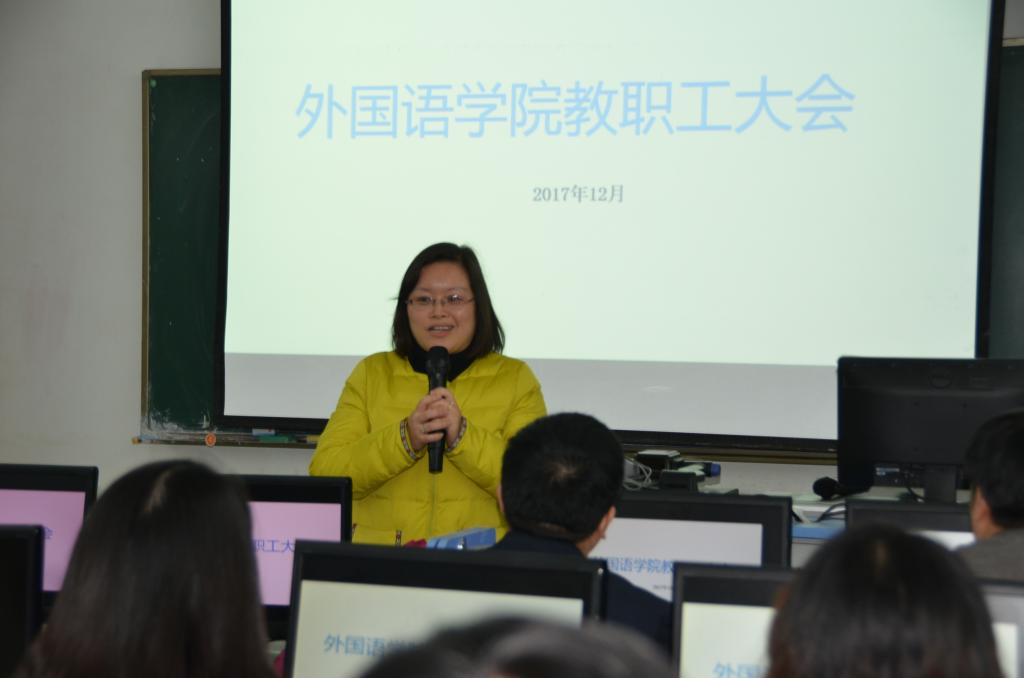 12月5日晚,西南石油大学外国语学院教职工大会在思学楼B307顺利召开。学校副校长郭建春出席会议并宣读了学校关于外国语学院新一届领导班子的任命文件,外国语学院新一届领导班子和全体教职工参加会议,外国语学院党委副书记孙德刚主持会议。