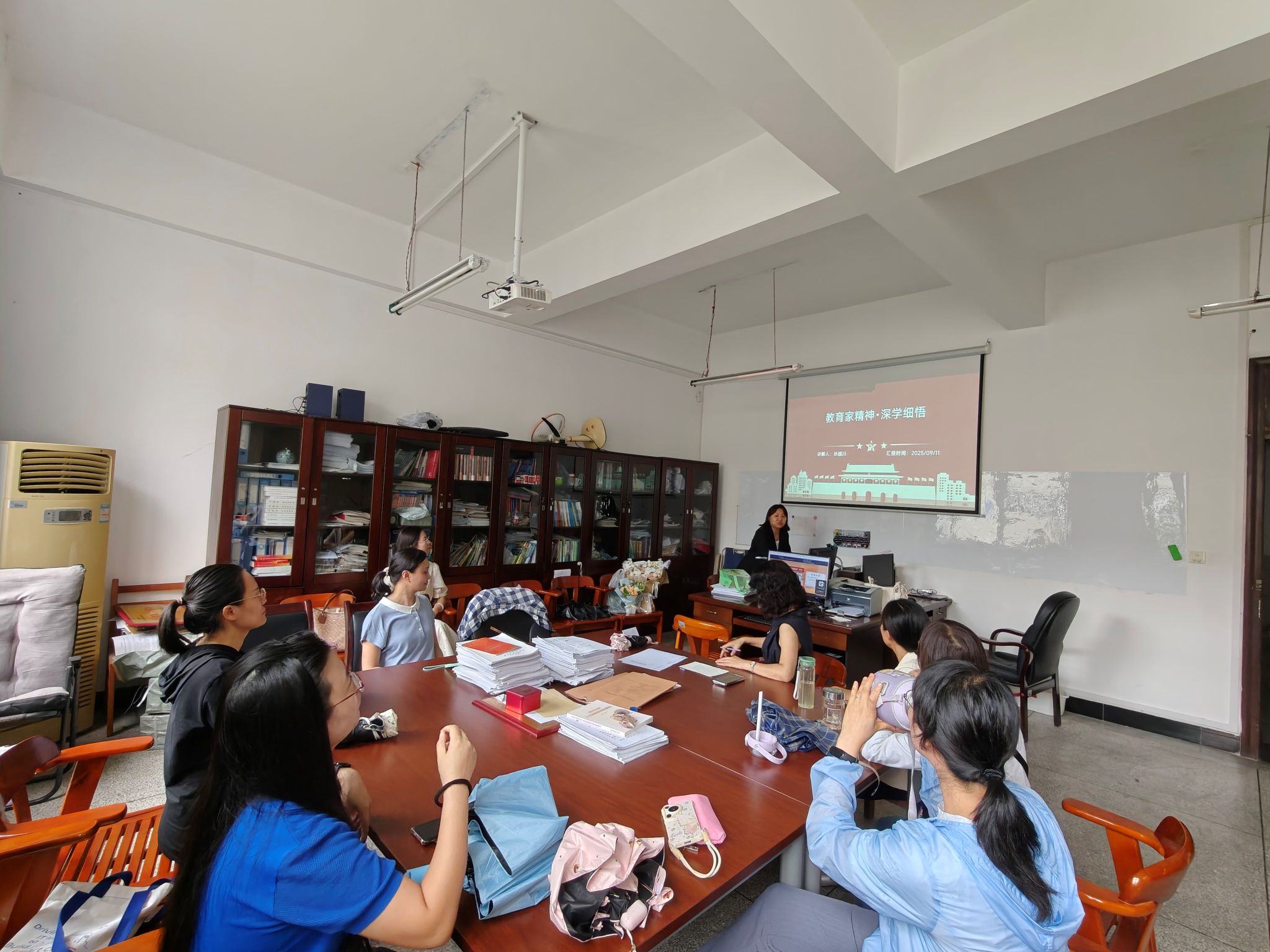 2025 年 9 月 11 日下午,为深入贯彻落实习近平总书记关于教育的重要论述,积极响应弘扬教育家精神的号召,英语专业教研室党支部开展了一场别开生面的主题党日活动,活动主题为“以教育家精神为引领,不断提升教书育人能力”。教研室全体党员教师踊跃参与,旨在通过深入学习与研讨,切实提升党员教师的教育教学水平,更好地践行立德树人的根本任务。