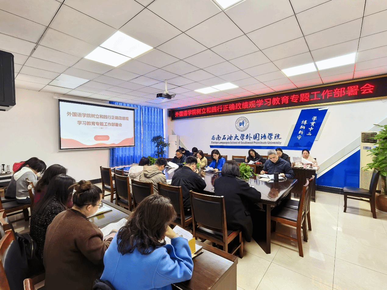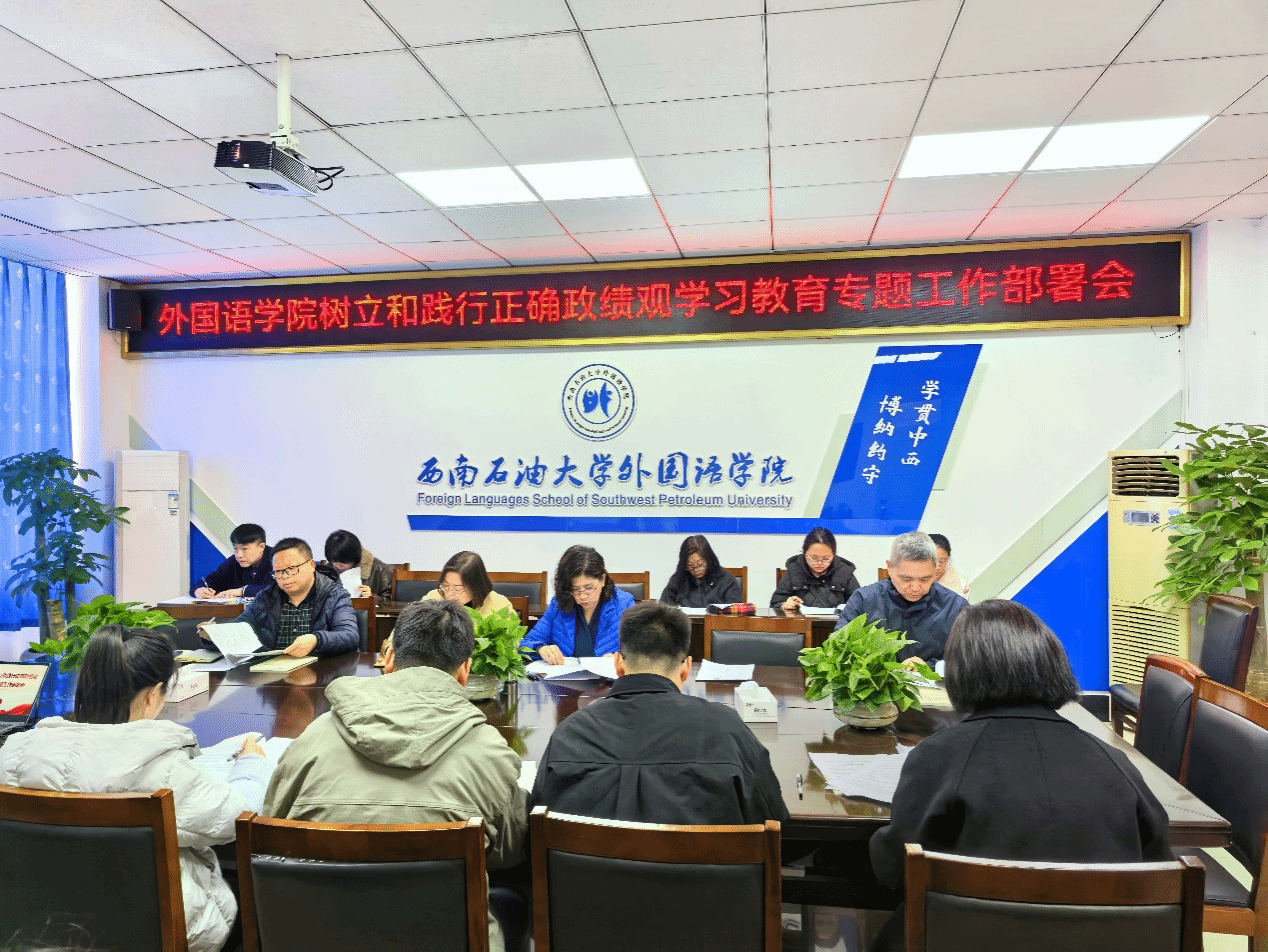 会上,姚明淑同志详细解读了学校党委印发的《关于在全校开展树立和践行正确政绩观学习教育的实施方案》(西南石大委组〔2026〕6号),并紧密结合外国语学院实际,对学院制定的《外国语学院关于开展树立和践行正确政绩观学习教育的实施方案》及《外国语学院树立和践行正确政绩观学习教育重点工作、时间节点及要求一览表(2026.3 - 2026.7)》进行了全面说明。根据方案,学院学习教育于2026年3月启动、7月底基本结束,以学院领导班子成员为重点,坚持聚焦主题、简约务实,一体推进学习研讨、查摆问题、整改整治、建章立制、开门教育五项重点工作,确保学习教育取得扎实成效。