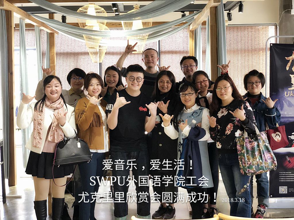 为丰富教职工业余文化生活,提高音乐素养,让学院教师在繁忙的工作之余能够轻松心情、陶冶情操、和谐家文化,2018年3月18日下午,外国语学院工会组织部分教职工及家属参加了由付航老师举办的尤克里里音乐分享会。