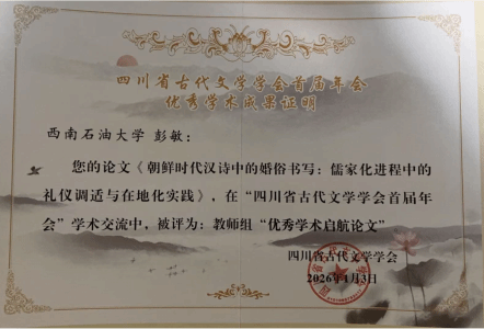 2026年1月2日至4日,“数智时代中国文学与文化研讨会暨四川省古代文学学会成立大会”在攀枝花学院圆满举行。本次会议由四川省古代文学学会、四川大学文学与新闻学院联合主办,攀枝花学院承办,系该学会首届年会,汇聚了省内外100余位知名学者与硕博学生。我院副教授彭敏老师受邀参会作主题报告,在会上发表最新研究成果,并荣获会议论文奖项。