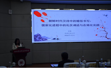 会议期间,彭敏老师作为青年学者代表,以《朝鲜时代汉诗中的婚俗书写:儒家化进程中的礼仪调适与在地化实践》为题作大会主题报告。该研究深入挖掘了朝鲜时代汉诗文献中的婚俗文化书写,聚焦于儒家礼仪在东亚汉字文化圈传播过程中的在地化调适与实践,展现了跨文化、跨学科的学术视野,引发了与会专家的广泛关注与好评。