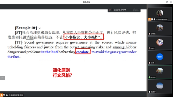 研讨反思:在译名堂研讨会上,主要针对六个案例进行讨论和分析,参与导师指出了以下问题:1)拼写错误等语法错误;2)原文语义理解错误;3)译文优化建议;4)理论和译文解析结合的问题;等。本人在此次研讨会上受益颇深,并在会后对论文进行了全面复盘,除了根据参会导师的建议对六个案例进行修改,同时还进一步修改了未在研讨会上讨论的其他案例,重点检查同类型的错误和关注可优化的内容。