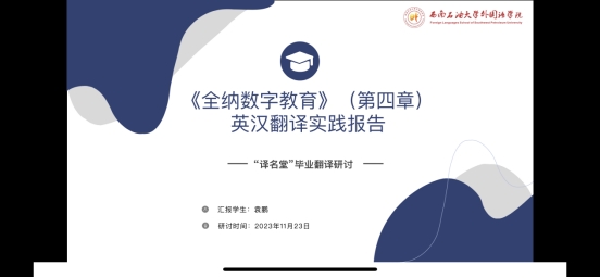 上周四晚上,我和李老师、黄老师和徐老师开始了一个半小时的译名堂毕业翻译研讨会。这次研讨会对我的翻译实践有着很大的益处感谢老师们百忙之中给与指导。我们通过飞书软件的视频会议讨论,三位老师帮助我分析了近十二个翻译案例,包括句法层面和语篇连贯层面的指导。