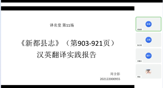 最后,关于中文定语、补语、状语修饰语过长的处理,老师们建议按照中文原文进行翻译,避免过多的删减和译者个人对其进行总结概括。《新都县志》本身承载的时间段就具有中国在不同时期的发展特点和时代性,如果译者按照现代化视角对其进行删减、总结概括式地翻译,会使《新都县志》失去时代特色,也将使译文成为一篇关于新都历史发展的导读性的文章,而不是详细记录新都各方面发展的百科全书。