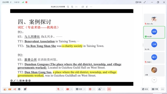 首先,在机构名称的翻译上,比如“与人同善社 在太兴乡”,译者提出TT1“Benevolent Association in Taixing Town”和TT2“Yu Ren Tong Shan She was a charity society in Taixing Town”两个译本。经查证,TT1中的“Benevolent”经常被用来命名国外的慈善机构,但《新都县志》中还会出现“仁和慈善会”、“仁德慈善会”等机构,这些机构名无法在目的语中找到既有译本,因此,为了使全文的机构名译法统一,译者更倾向用拼音的方式音译,这一点也得到了参会老师的认同。与此同时,老师们更建议用“拼音+性质属性”的方式来翻译机构名,如“与人同善社Yu Ren Tong Shan Association”和“仁德慈善会Ren De Charity Society”等。