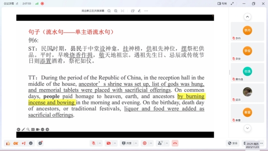 其次,在讨论如何翻习俗礼仪类的文化负载词时,老师们建议使用“拼音+脚注”的方式来处理,且脚注中还需要出现拼音所对应的中文文化负载词本身,这样做一是为了使译文看起来更加简洁,做到在译本也能保持信息型文本的特点;二是为了目的语读者在查阅脚注时能够快速对应该文化负载词在原文中出现的地方,以免出现文化负载词“拼音+脚注”在译文中出现较多,目的语读者因此感到混淆的情况。