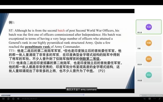 研讨反思:膝跳反射可以将它直译出来,也可以说这个高级国防控制组织,然后导致它只能在战略层面上做出下意识反应,这个下意反应就是是一些错误的反应。类似于说是它一个隐喻,就是像膝跳反射那样的一个纯粹无意识的一个反应。所以可以直接直译,但是加个引号就表明了它其实是个隐喻的用法,但是几个人整个小组要统一。在整个文本翻译过程中,每个人的文本都是该书的一部分,所以部分不能脱离整体,要有全局意识,和组内成员多沟通,统一术语。