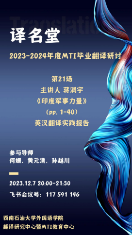 《印度军事力量》英译中翻译项目。该书于2020年由印度新德里市玛纳斯出版社(Manas Publications)出版发行,全书共281页,全文共计八万一千余字。译者负责该图书序言及第一二章部分,共计一万七千余字的英译中翻译工作。