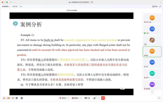 在这次研讨中,除了解决了我自己提出的问题,老师们还从案例中指出了另一些我没发现但真实存在的问题。如部分句子的表达上还存在着不够准确和流畅的问题。有时候我会过于依赖字面意思,而忽视了整体语境的影响,导致翻译的结果不够自然。老师们针对此类问题逐一给出了她们的见解,我也进一步学习了如何加强对语境的理解和分析能力,以提高翻译的准确性和流畅度。