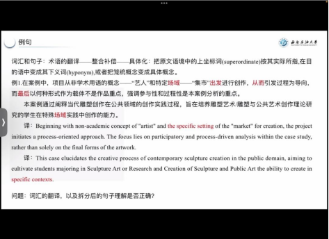 本次研讨会上对译者译文的语法、结构、用词等方面进行了讨论。首先,有的句子存在逻辑表达不清、信息冗余、主语错误、用词不当以及悬垂修饰语等问题。会后学生根据老师的建议进行了修改,在翻译时要注重译文的逻辑和连贯性,用词的搭配也要谨慎。其次,还需要注意,由于文本中有一定的文化负载词,有的内容最好通过使用尾注的方式让其表达地更加清楚。
