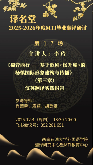 《蜀音西行——基于歌剧<杨升庵>的杨慎国际形象建构与传播》以现代歌剧《杨升庵》为主要媒介,以中国明代著名人物杨慎(号升庵)为研究对象,从历史生平、艺术再现、媒介表达、文化传播等多个维度系统探讨杨慎形象在国内外的建构逻辑与传播路径,并尤其关注其形象在国际舞台上的转化与接受过程。全书共六章,其中,译者负责本书第三章《历代杨慎形象建构与传播综述》的翻译,总计约1.5万字。这一章节既分析了杨慎在传统文献如正史、地方志、笔记中的形象呈现,也探讨了戏剧演绎、民间叙事以及当代媒体对其形象的再创与演变,全面呈现了该文化形象跨越历史与媒介的多重面貌。
