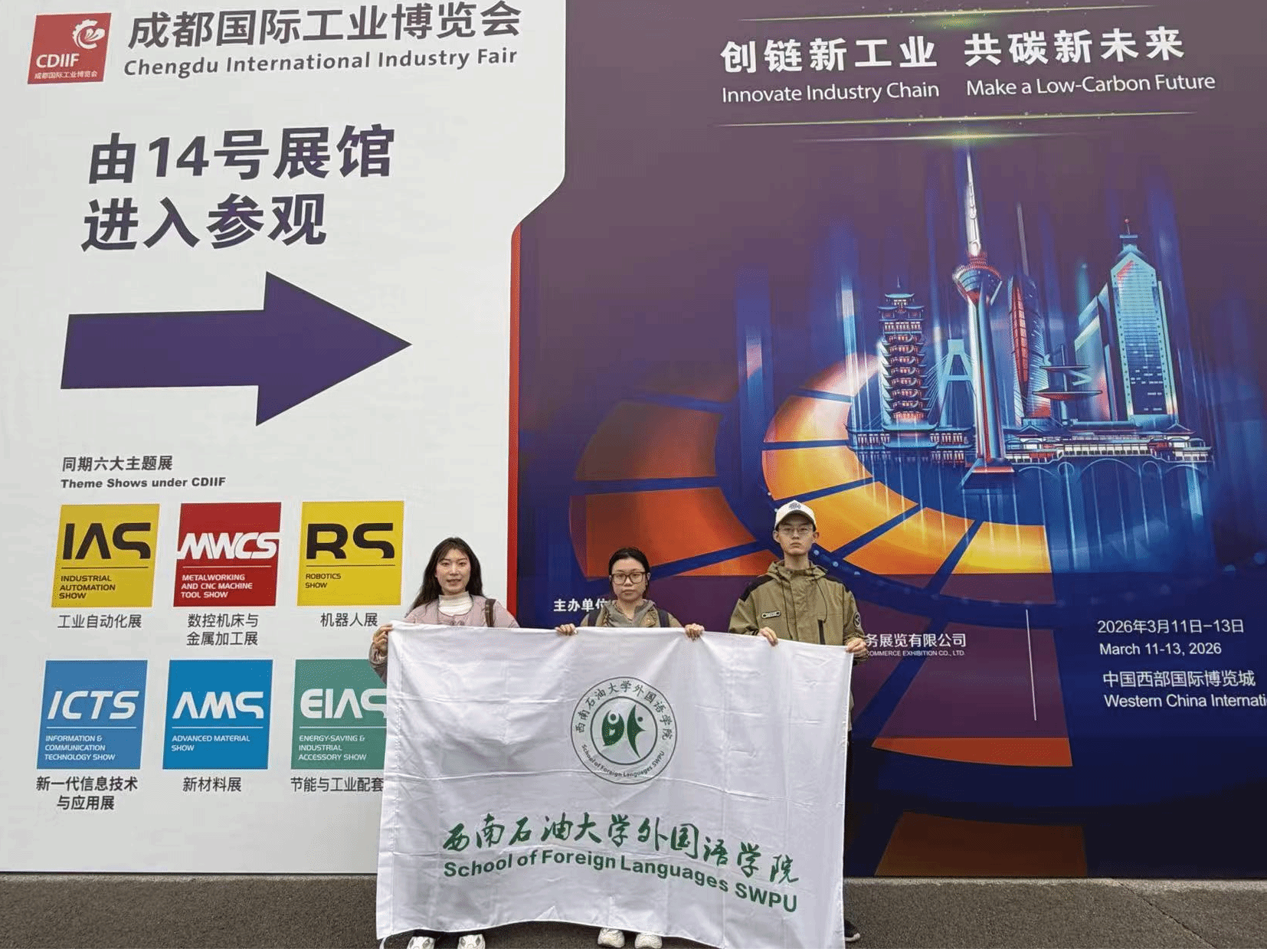 为深化产教融合、拓宽学生专业视野,切实发挥实践育人作用,3月13日,我院辅导员史玉华带领学生前往中国西部国际博览城参观2026成都国际工业博览会(以下简称“成都工博会”),立足外语专业所学开展研学活动。