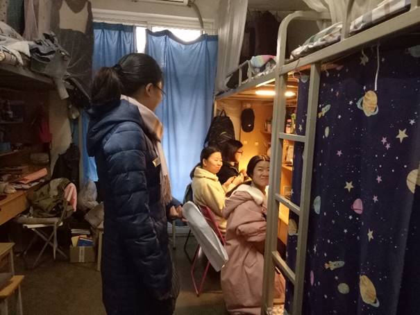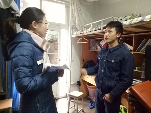 安全隐患排查之外,夏老师及彭老师还询问同学们的今后打算、努力目标等等,也为大家分享了经验、给出建议。对于大四学生,当被问到今后打算、是否找到工作等时,回答各有不同。有的同学签了合同,有的同学准备考研,还有的同学准备考公务员,希望他们一切顺利。学生会成员也积极参与工作,热心与同学们问好。