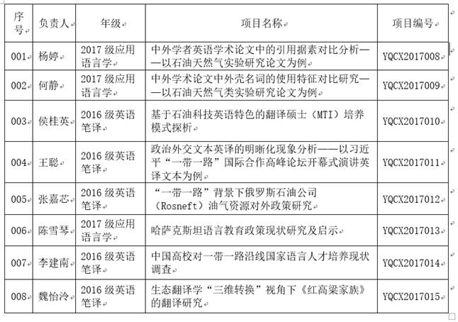 为激发研究生的科学研究热情,提升我院研究生培养质量,我校外国语学院根据《西南石油大学外国语学院在读研究生创新基金项目实施细则》,启动了2017年度(下半年)外国语学院研究生创新基金项目申报工作。