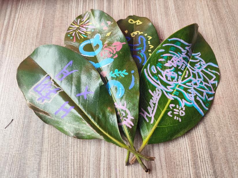 采集结束,师生们返回活动场地进行创作。活动现场提供了画纸、颜料、画笔,以及社团准备的各类树叶、剪刀、胶水等材料。创作形式丰富多样,包含树叶拼贴、拓印以及在树叶上直接绘画等。大家充分发挥创意,将文学元素巧妙地融入作品中,创作出了一个个富有故事和内涵的作品。有的同学以树叶拼贴出书中的经典场景,有的则通过拓印展现自然与文学的融合之美,还有同学在树叶上绘制出充满诗意的画面。